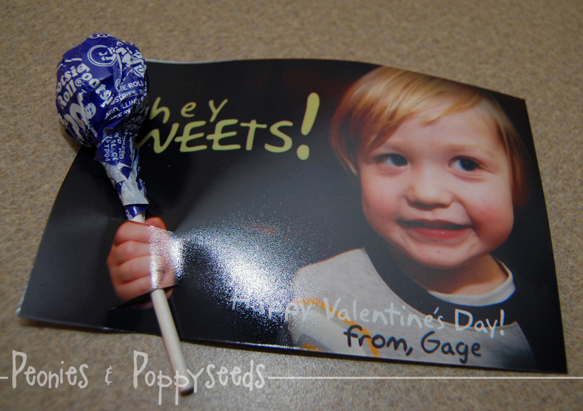 Then insert a lollipop of your choice and have your kids take the finished Valentines to school where everyone will be jealous since they only have little generic paper things to hand out.