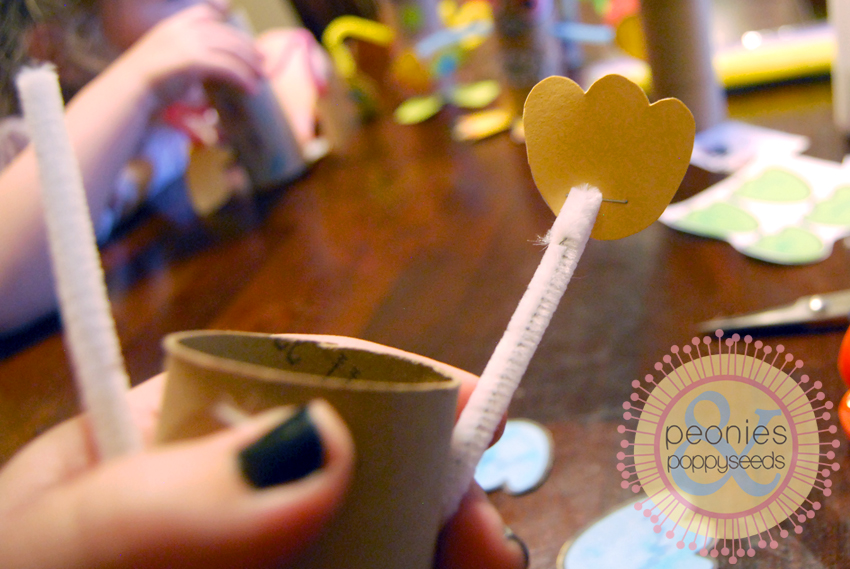 You'll need the TP Rolls, scissors, glue, tape, stapler, pipe cleaners and a piece of cardstock of any color. Oh, and also get your kids. And if you want, get some crayons or markers.