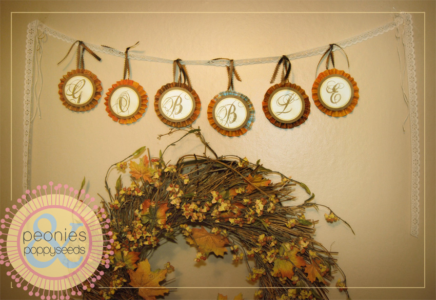 I wanted to make a Thanksgiving banner and I almost made one that said "Give Thanks" but then I thought, "BORING" so I made one that says "Gobble" instead (which is only slightly less boring, but there's only so many Thanksgiving sayings out there).