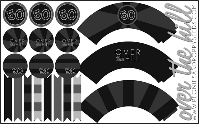 Here's the second part of the "Over the Hill" party pack. You get 3 cupcake wrappers, 9 two and a half inch circles, and 16 mini flags. And, once again, you can download these for a 30th, 40th, or 50th birthday party.