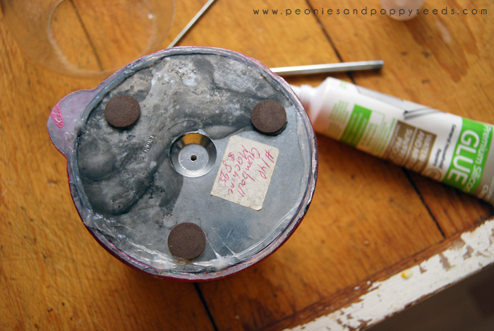After the glue was set I added water and a fish. I also wanted to still have the top on my gumball machine, but the opening was bigger than the original glass top, so I improvised by gluing the machine top to a Yankee candle lid I had sitting around. It worked great. (Except that we mostly leave it off because the fish needs to breath, but when people come over I can just stick it back on so it looks all impressive like.)