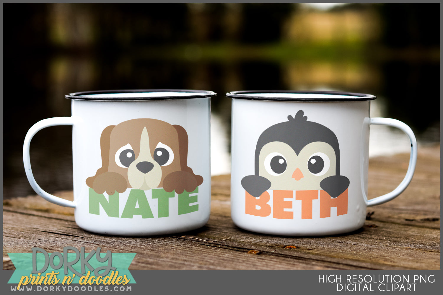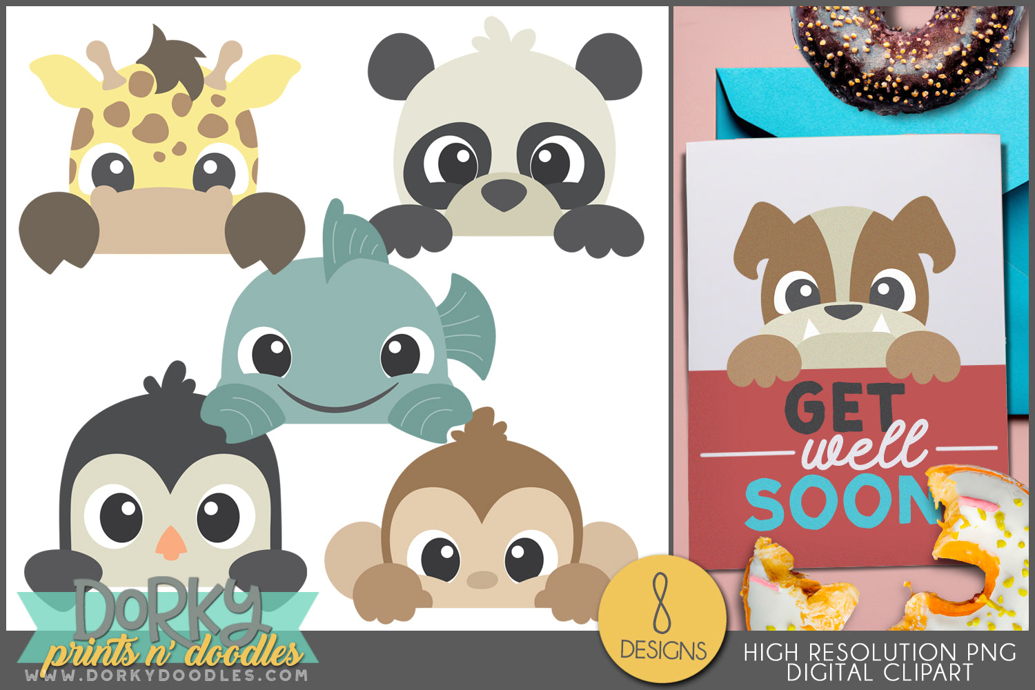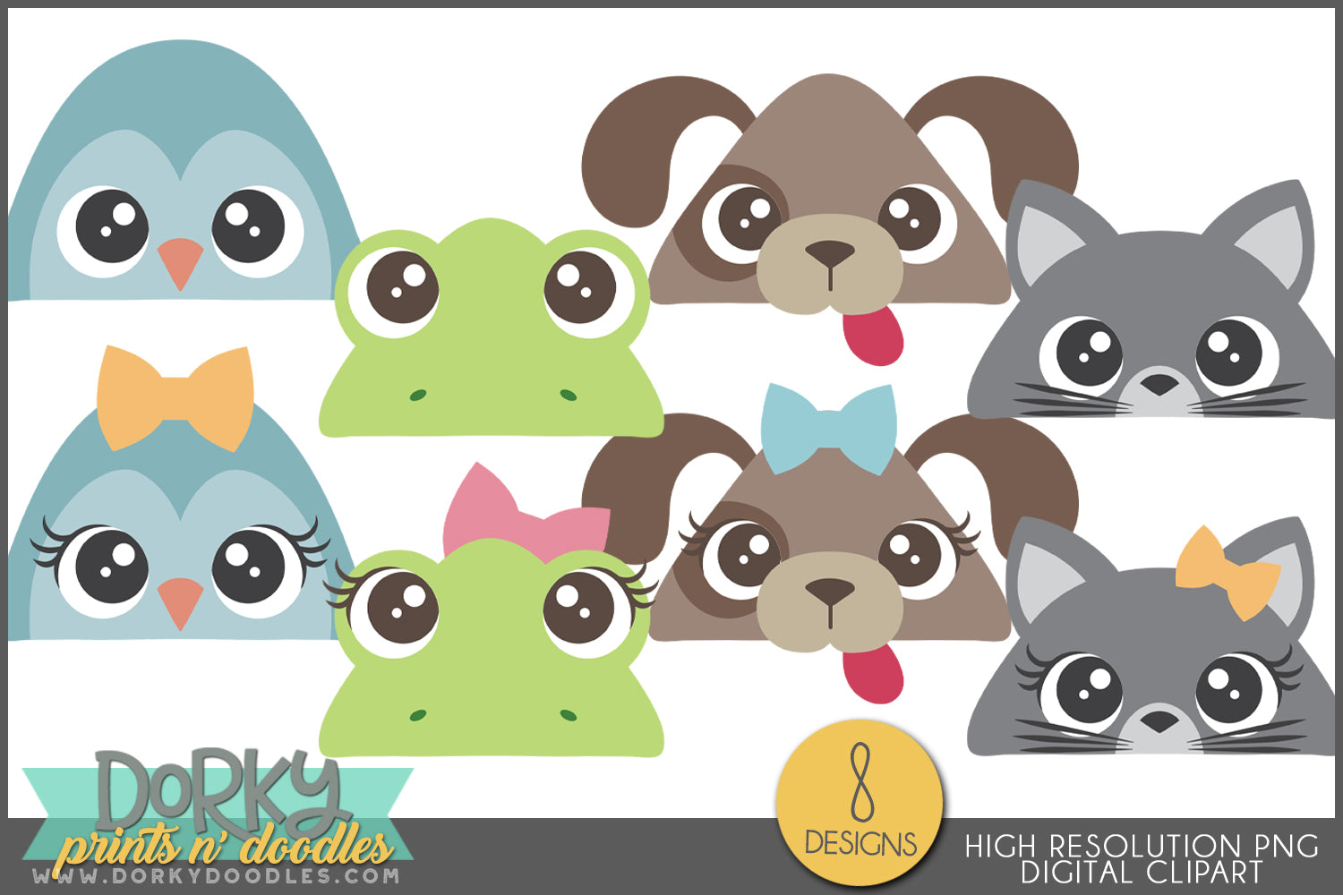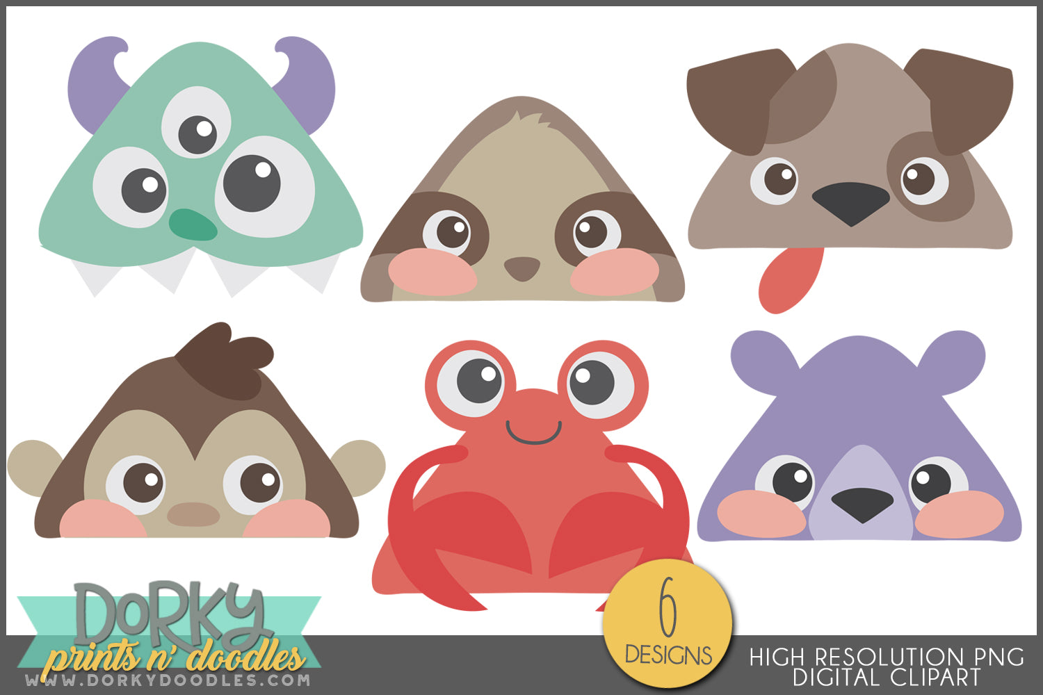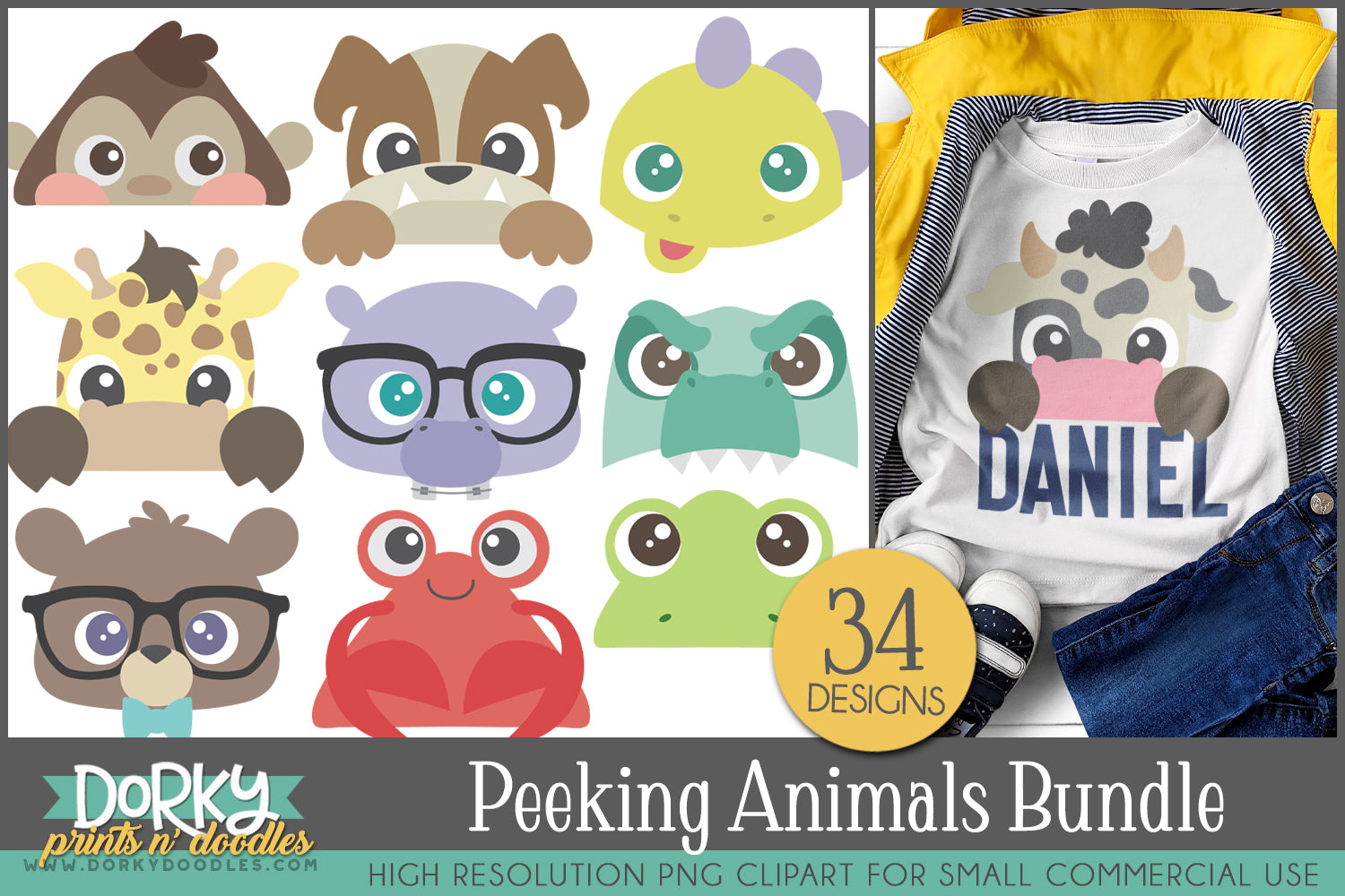 This 34-image Peeking Animals Clipart Bundle includes adorable dog, cat, frog, panda, penguin, monkey, and dinosaur faces perfect for t-shirts, labels, posters, and stickers. PNG format with transparent backgrounds.