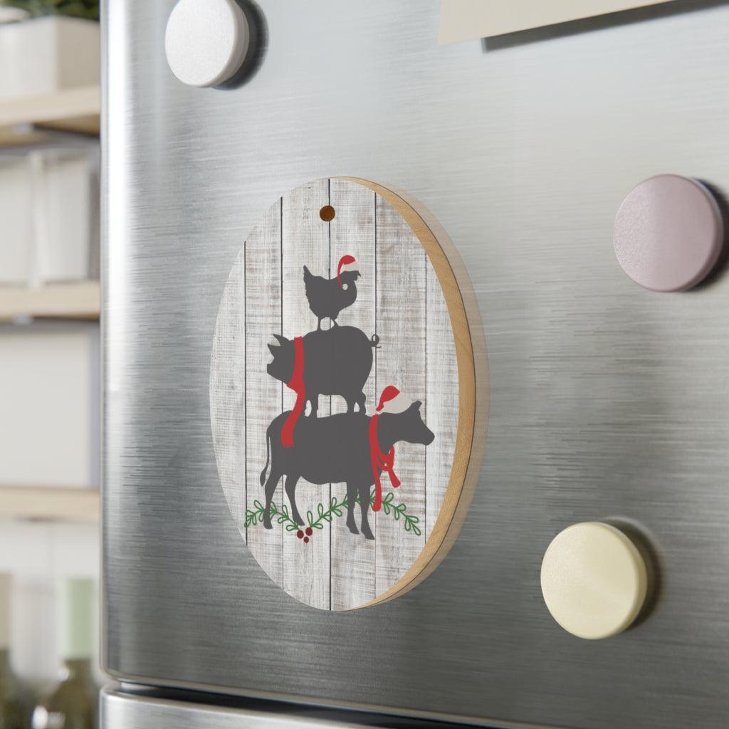 This fun Christmas ornament will add a touch of whimsy to your home! The stack of farmhouse animals are all decked out for the holidays! This can hang on your tree, or the magnetic back will make it stick to your fridge.
