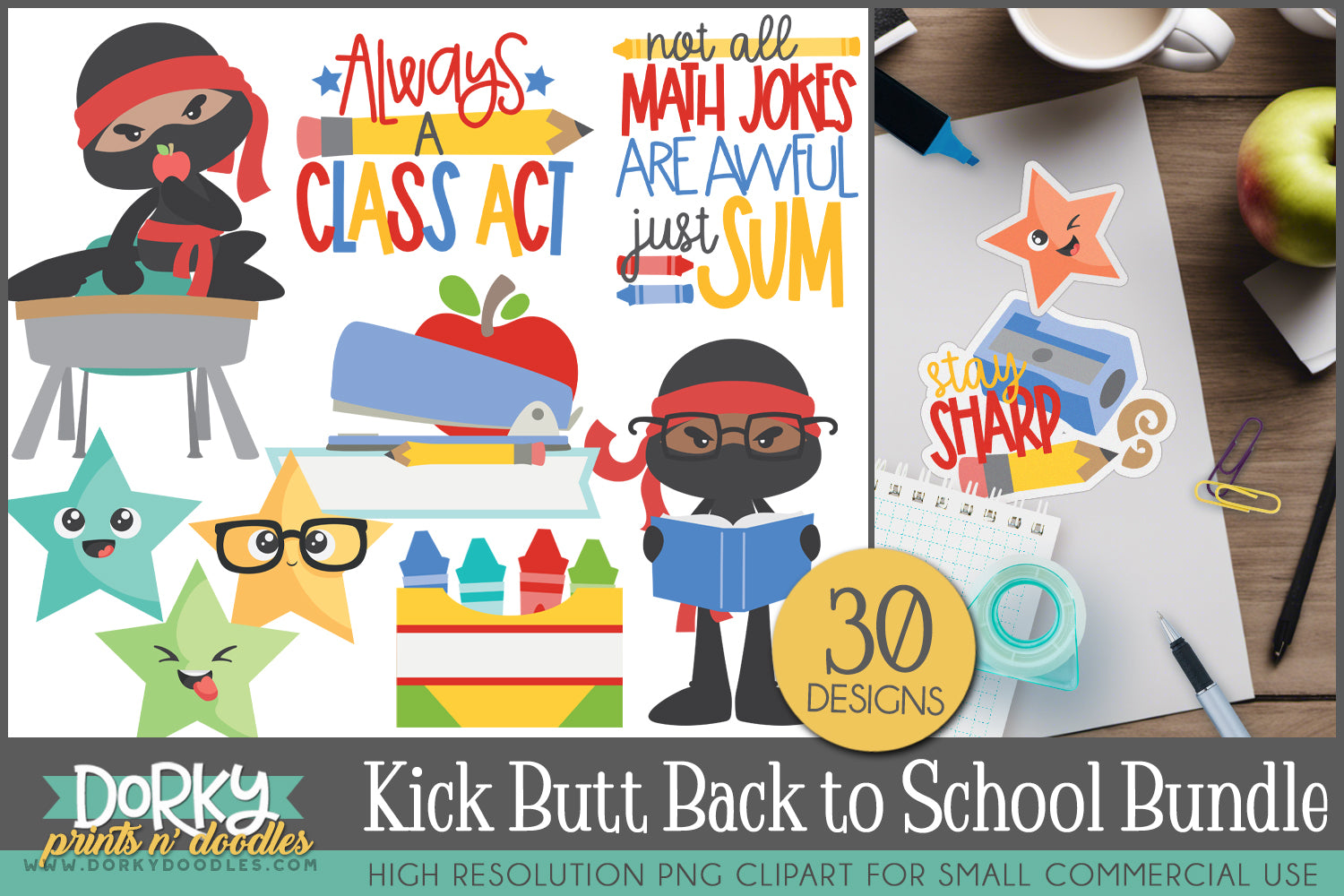 This fun 30-image Back to School Kick Butt Clipart Bundle features school ninjas, colorful school sayings, editable label banners, school puns, and cute star characters. Perfect for humorous classroom decor, stickers, sublimation, and teacher printables. All files are high-resolution PNGs with transparent backgrounds.