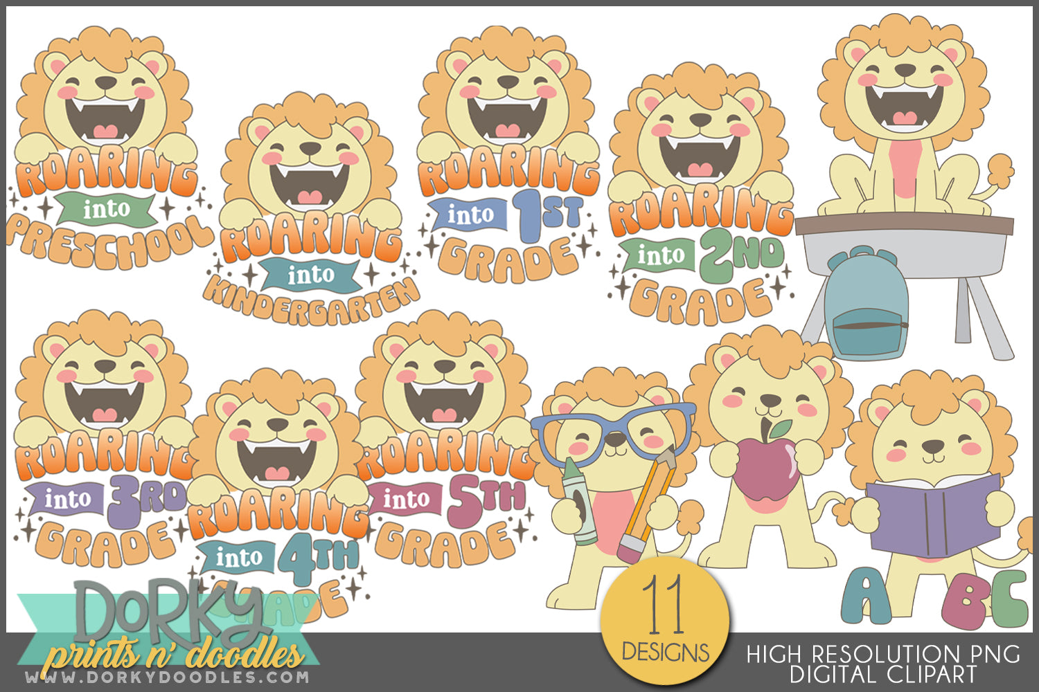 Add a wild touch to your back to school projects with our "Roaring Into 1st Grade" lion clipart! Each grade is covered from preschool to 5th grade, plus you get a matching lion images for other projects!