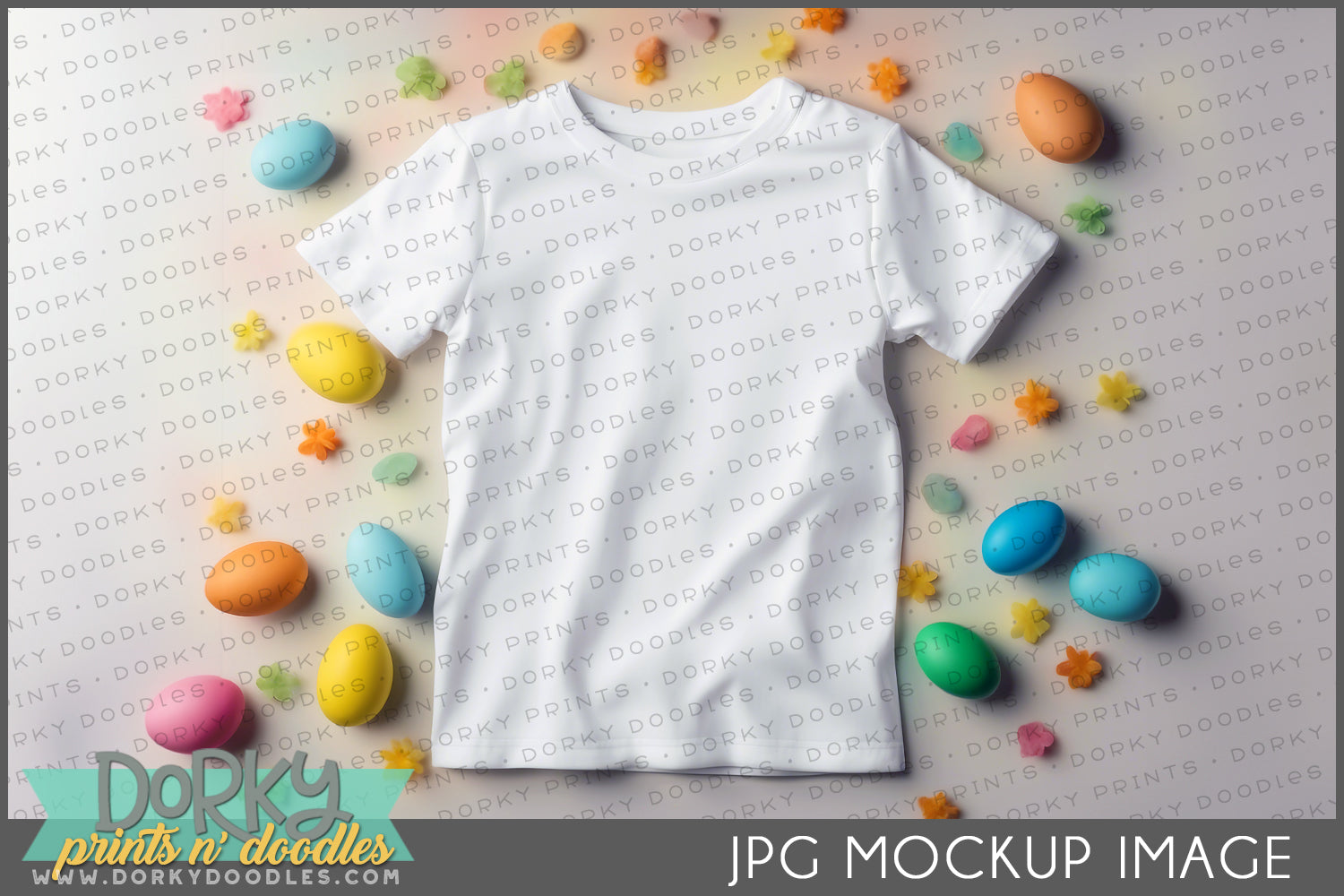 The shirt's white fabric highlights the vivid colors and intricate details of any artwork, making it an excellent choice for seasonal motifs such as blooming flowers, playful bunnies, or delicate Easter eggs. The mockup is staged with a soft, natural light that enhances the visual appeal of the garment and any added design, ensuring that the final product is displayed in its best light. This setup not only allows crafters to vividly imagine their designs on a wearable item but also provides their customers with a clear and attractive preview of what they can expect.