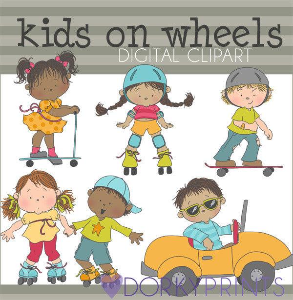 These kids on wheels look fabulous in scrapbooks, party invitations, and holiday decor! You will get 5 Digital Clip Art images in high resolution PNG format (they come as a ZIP file that you can download instantly once payment has cleared).