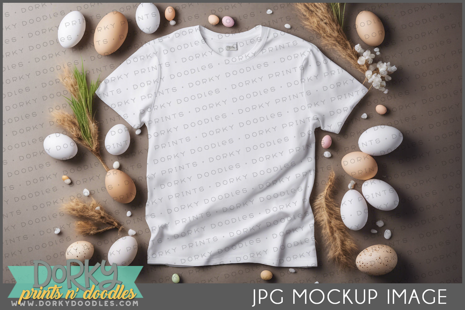 The shirt's white fabric highlights the vivid colors and intricate details of any artwork, making it an excellent choice for seasonal motifs such as blooming flowers, playful bunnies, or delicate Easter eggs. The mockup is staged with a soft, natural light that enhances the visual appeal of the garment and any added design, ensuring that the final product is displayed in its best light. This setup not only allows crafters to vividly imagine their designs on a wearable item but also provides their customers with a clear and attractive preview of what they can expect.