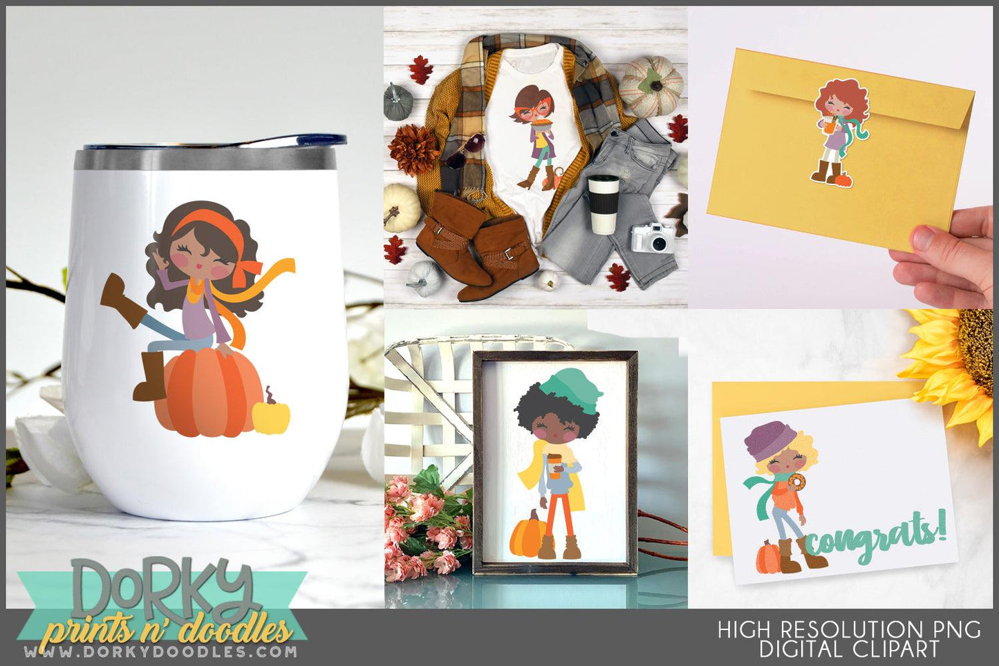These cute pumpkin spice girl images look fabulous in scrapbooks, planners, party invitations, cookies, stickers, and decor! You will get 6 Digital Clip Art images in high resolution PNG format (they come as a ZIP file that you can download instantly once payment has cleared).