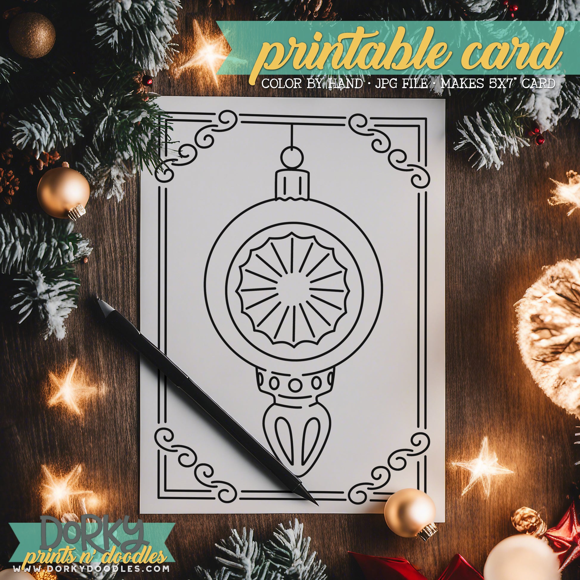 Retro Ornament - Hand Drawn Christmas Coloring Cards - Printable Holiday Greetings - Instant Download