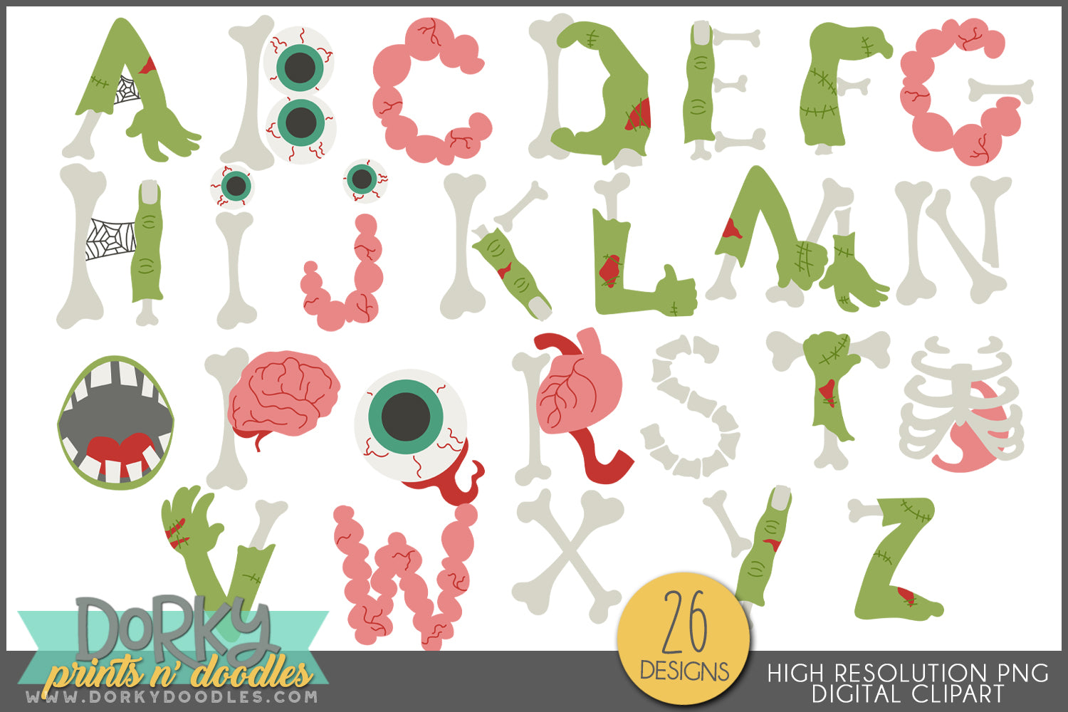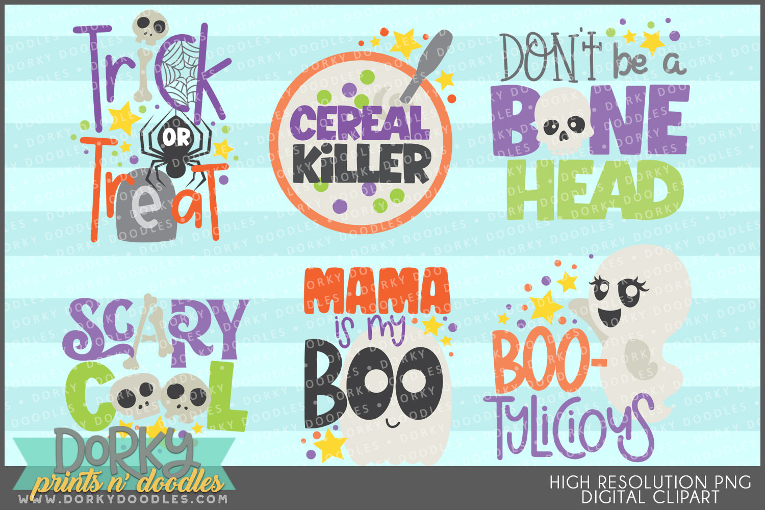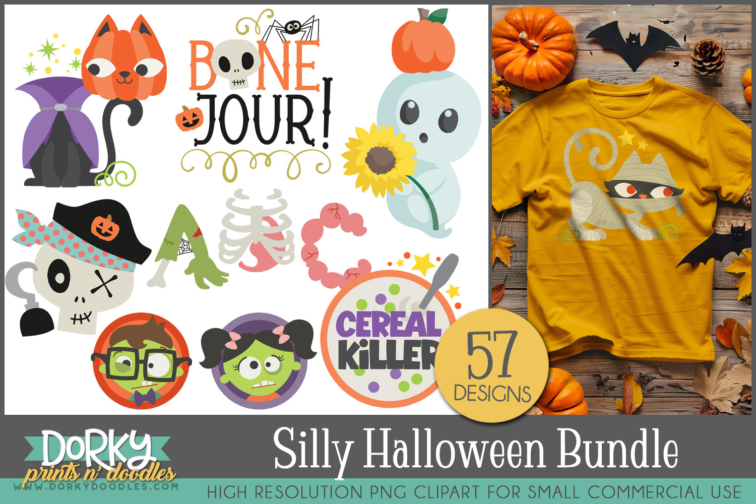 This 57-image Silly Halloween Clipart Bundle includes whimsical skulls, funny Halloween cats, humorous sayings, zombie kids, and bone/gut zombie letter alphabets. Great for kid-friendly Halloween crafts, stickers, and t-shirts. PNG format.