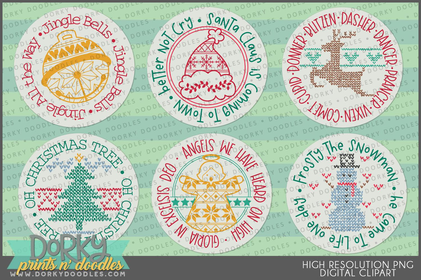 These round holiday song lyric images look fabulous on cookies, stickers, cards, in scrapbooks, party invitations, planners, sublimation projects, teacher worksheets, and decor! You will get 6 Digital Clip Art images in high resolution PNG format (they come as a ZIP file that you can download instantly once payment has cleared).