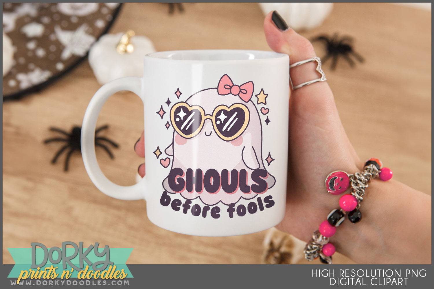 - "Ghouls Before Fools" ghost with heart sunglasses