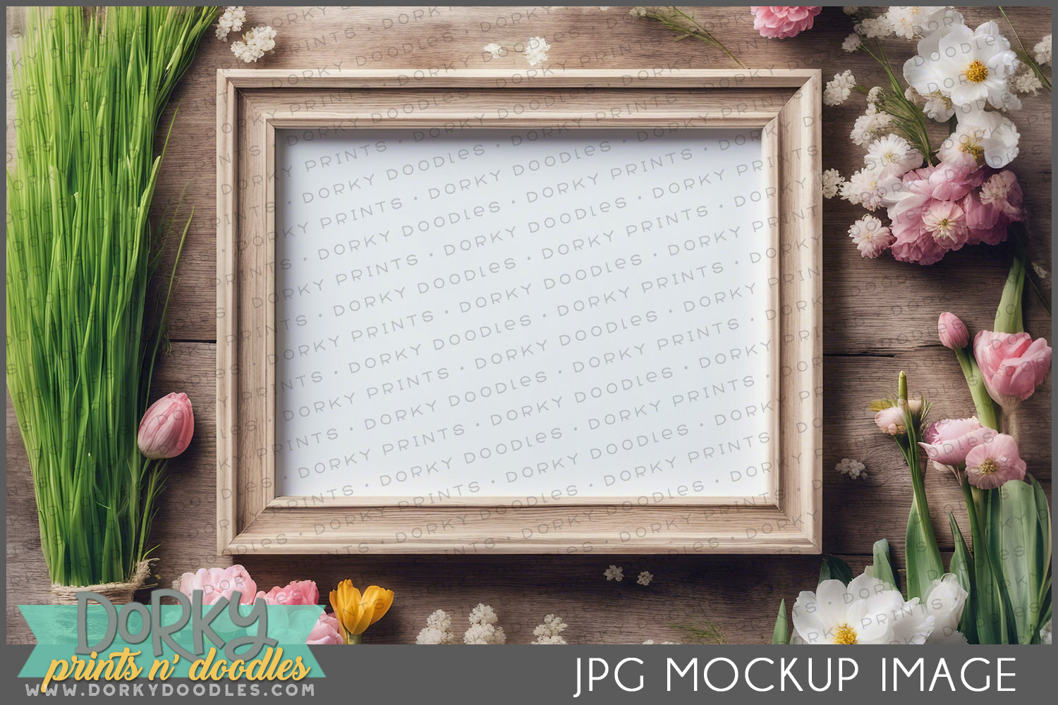 This framed art mockup features a sleek, clean frame, serving as a blank canvas ideal for artists and designers looking to showcase their unique creations. The background setting is meticulously chosen to complement spring and/or Easter designs, making the artwork within the frame pop with seasonal vibrancy.