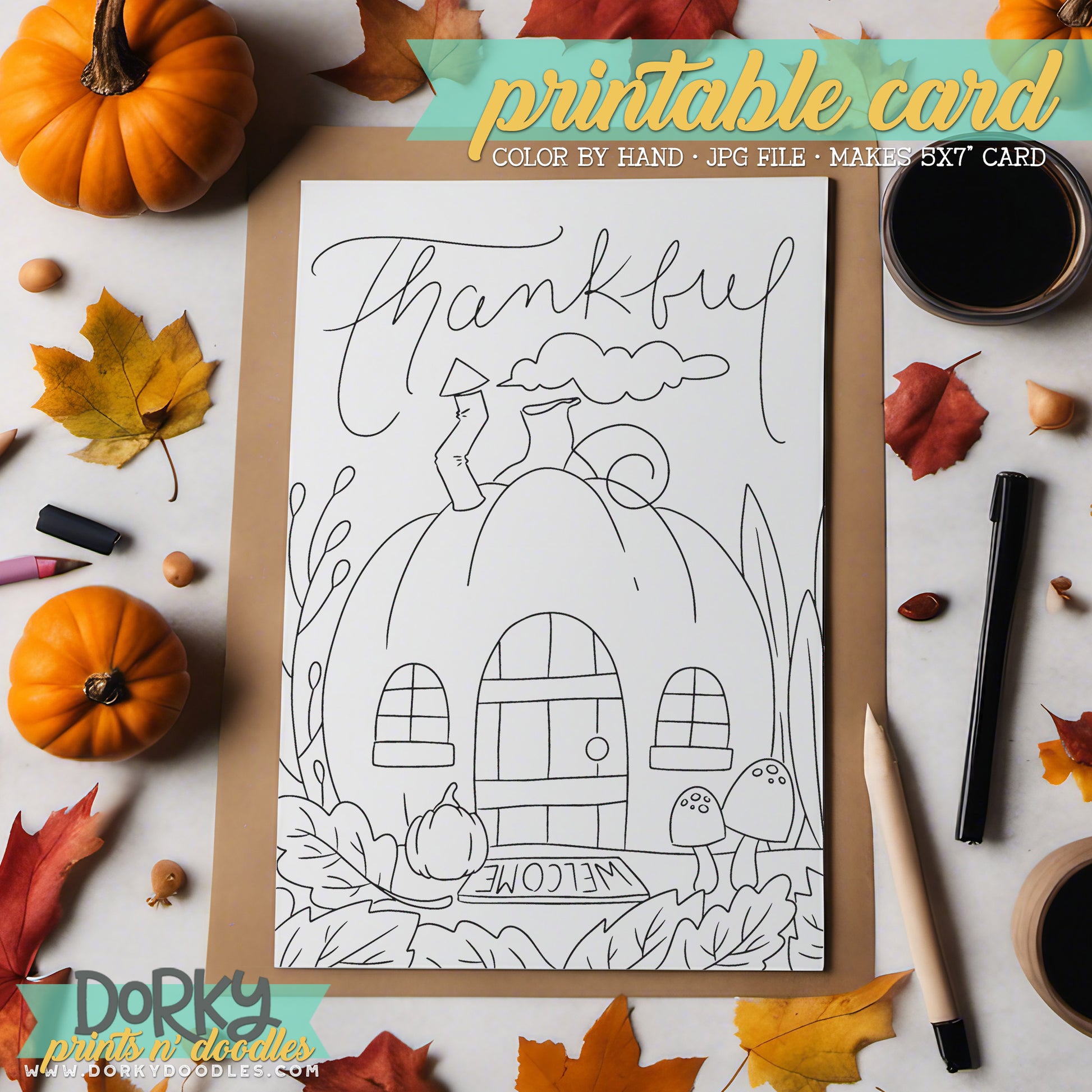 Thanksgiving Pumpkin - Hand Drawn Printable Coloring Greeting Cards - Instant Download for Personalized Gifts