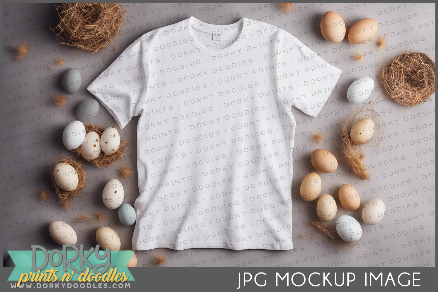 The shirt's white fabric highlights the vivid colors and intricate details of any artwork, making it an excellent choice for seasonal motifs such as blooming flowers, playful bunnies, or delicate Easter eggs. The mockup is staged with a soft, natural light that enhances the visual appeal of the garment and any added design, ensuring that the final product is displayed in its best light. This setup not only allows crafters to vividly imagine their designs on a wearable item but also provides their customers with a clear and attractive preview of what they can expect.